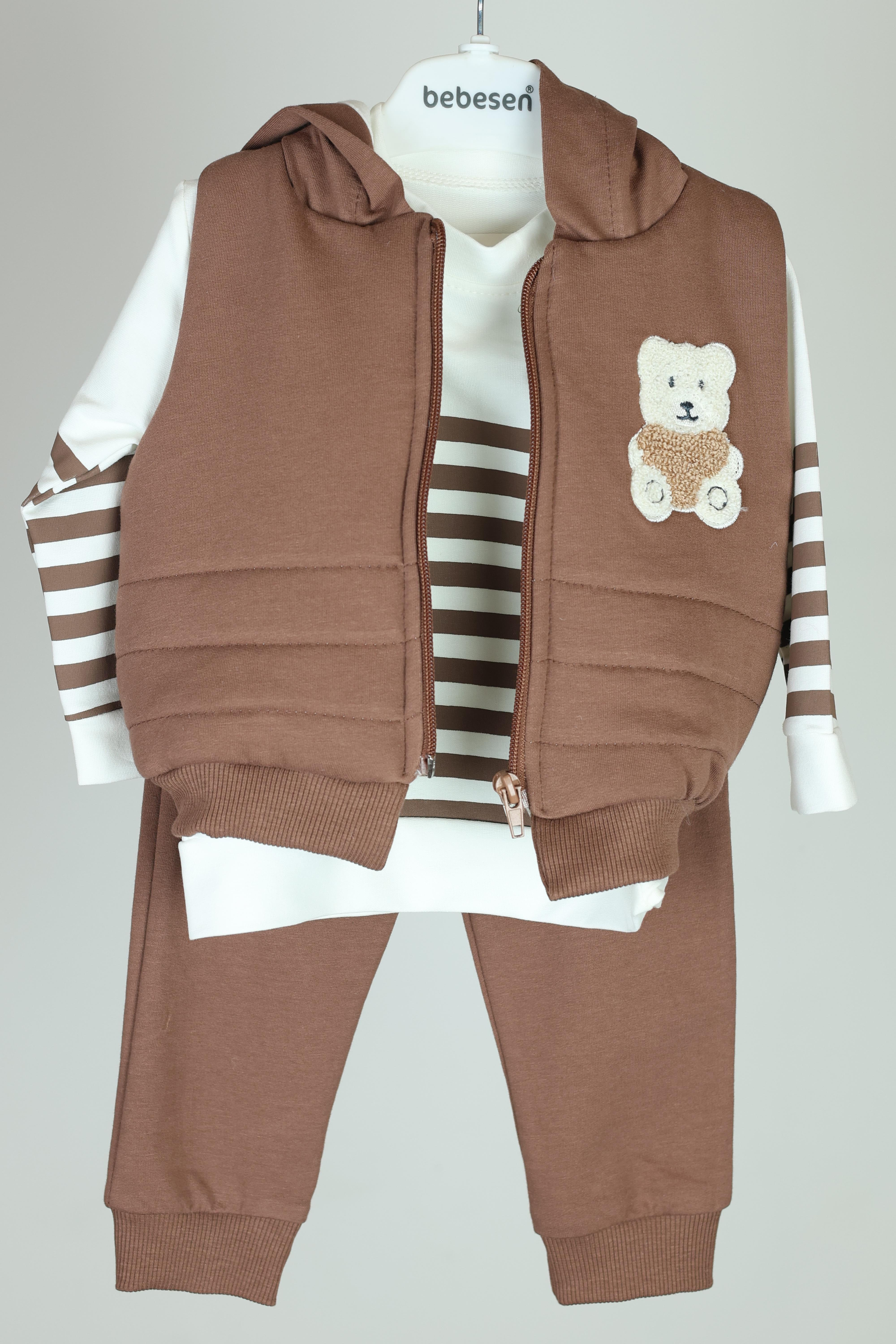 Ayıcık Nakışlı Bebek Üçlü Takım - 9-18 Ay - Kahverengi (8352-5)