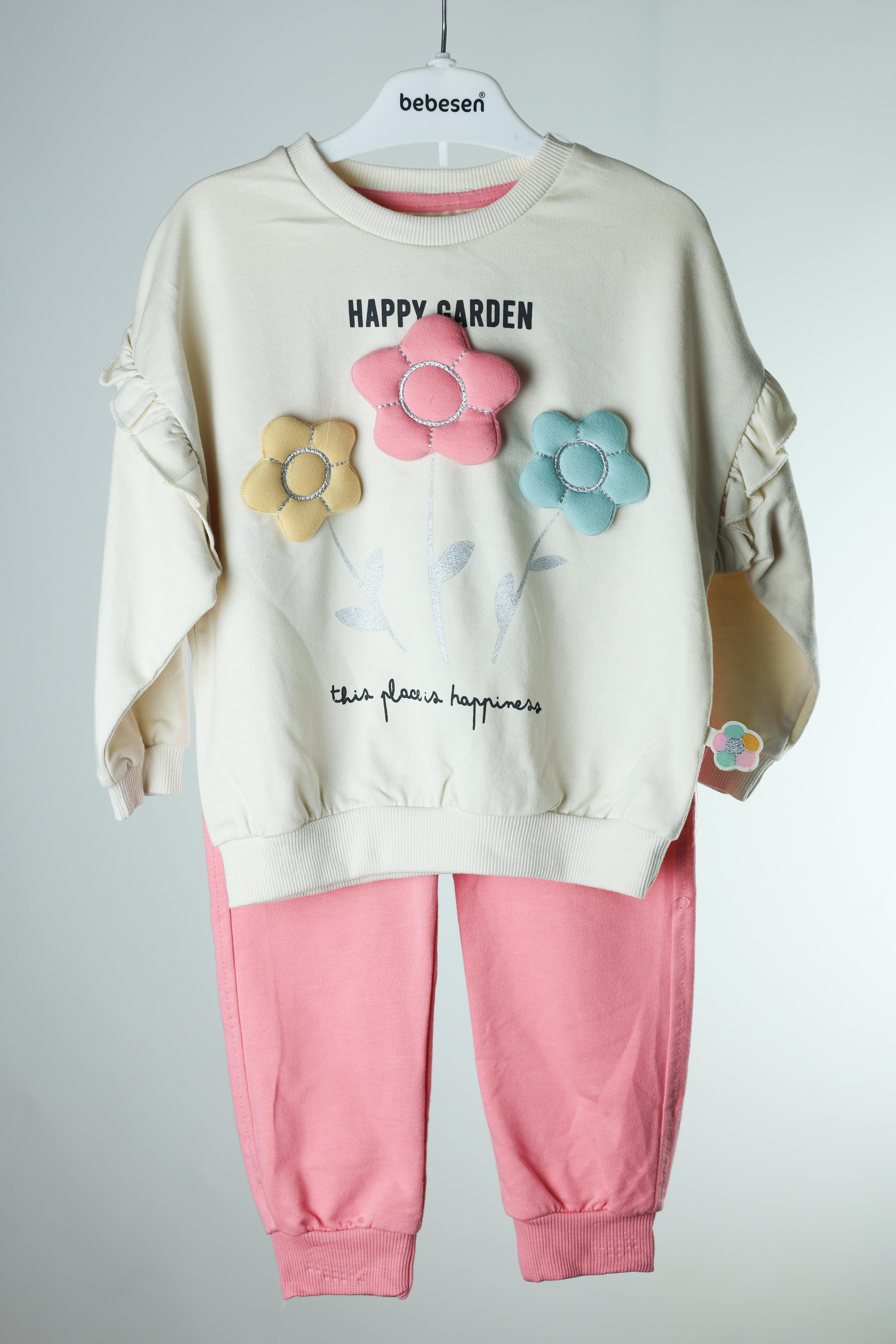 Çiçek Süslemeli Baskılı Kız İkili Takım - 3-6 Yaş - Pembe